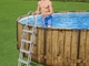 Basen Bestway Wood Swim Vista (pojemność 23 062 litrów) to samonośny basen rodzinny. Basen naziemny do montażu natynkowego wykonany jest z trójwarstwowego PVC. Dzięki metalowej konstrukcji jest bardzo mocny i stabilny. Zachwyca prostym montażem i długą żywotnością.