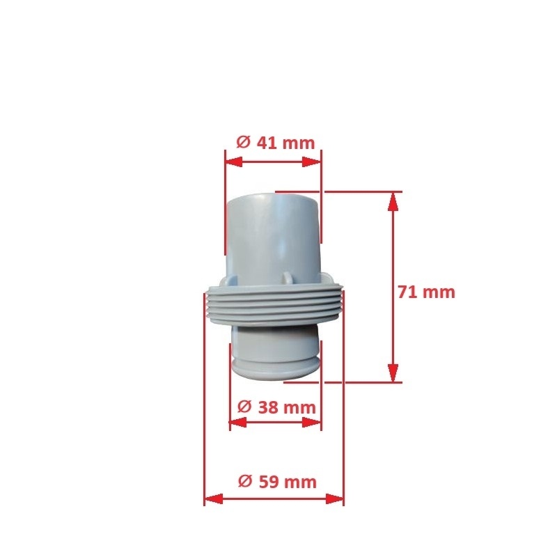 Adapter mocuje się do wylotu z basenu o średnicy 32 mm, a z drugiej strony podłącza się wąż z gwintem 38 mm.