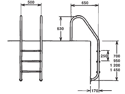Schody przeznaczone są do basenów prywatnych i komercyjnych. Wykonane są z polerowanego stal nierdzewna AISI 304 o średnicy 43 mm. Stopnie uzupełniają antypoślizgowe stopnie. Kotwica jest dostarczana z obudową i zaciskiem do uziemienia. UWAGA stopnie nie są odpowiednie dla basenów ze słoną wodą. Wersja słonowodna schodów może być dostarczona za dodatkową opłatą Łączniki podporowe (końce schodu pod wodą) nie są częścią zestawu – należy je zakupić osobno.