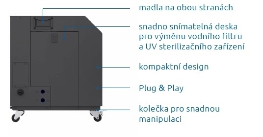 Wewnątrz urządzenia znajduje się pompa obiegowa z systemem samozasysającym, filtr wody, sterylizator UV i filtr kartridżowy.