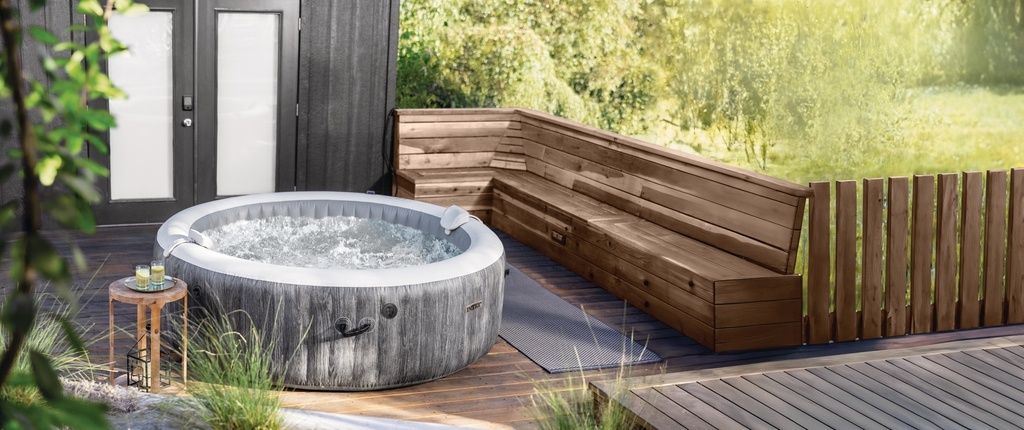 Nowa generacja wanien INTEX z dekorem drewnopodobnym oferuje doznania wellness na najwyższym poziomie. Wanna spa Pure Spa o średnicy zewnętrznej 216 i wysokości ściany 71 cm zapewnia miejsce dla maksymalnie 6 osób.