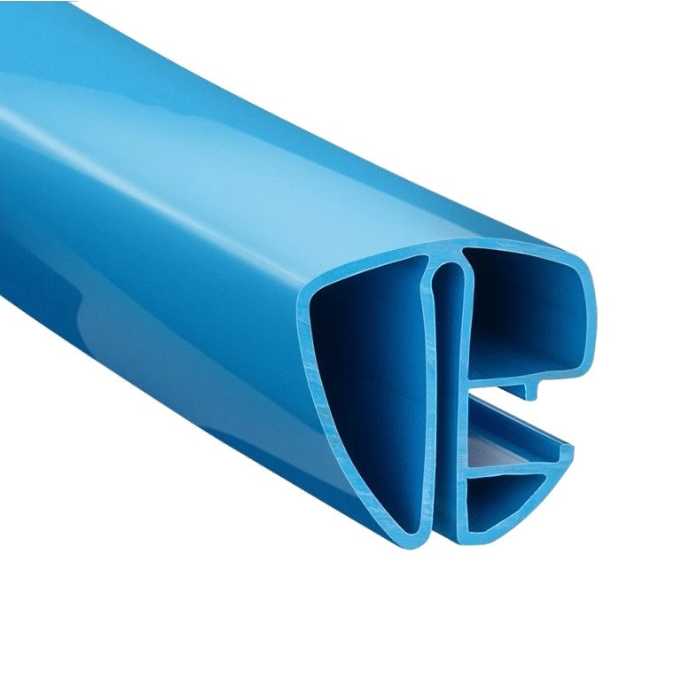 Zestaw niebieskich szyn do basenu owalnego, umożliwiających przymocowanie wykładziny o wymiarach 4,16 x 8,0 m.