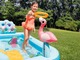 Zestaw zawiera zjeżdżalnię wodną, nadmuchiwaną palmę, flaminga, małpkę, pierścienie do zabawy i 5 balonów