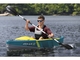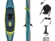 Nadmuchiwany kajak dla jednej osoby, w zestawie wiosła i pompka ręczna.