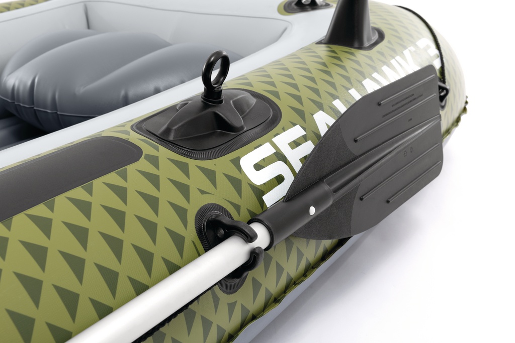 Ponton Seahawk 3 Set przeznaczony dla 3 osób. Zestaw zawiera ponton, dwa wiosła i pompkę ręczną.
