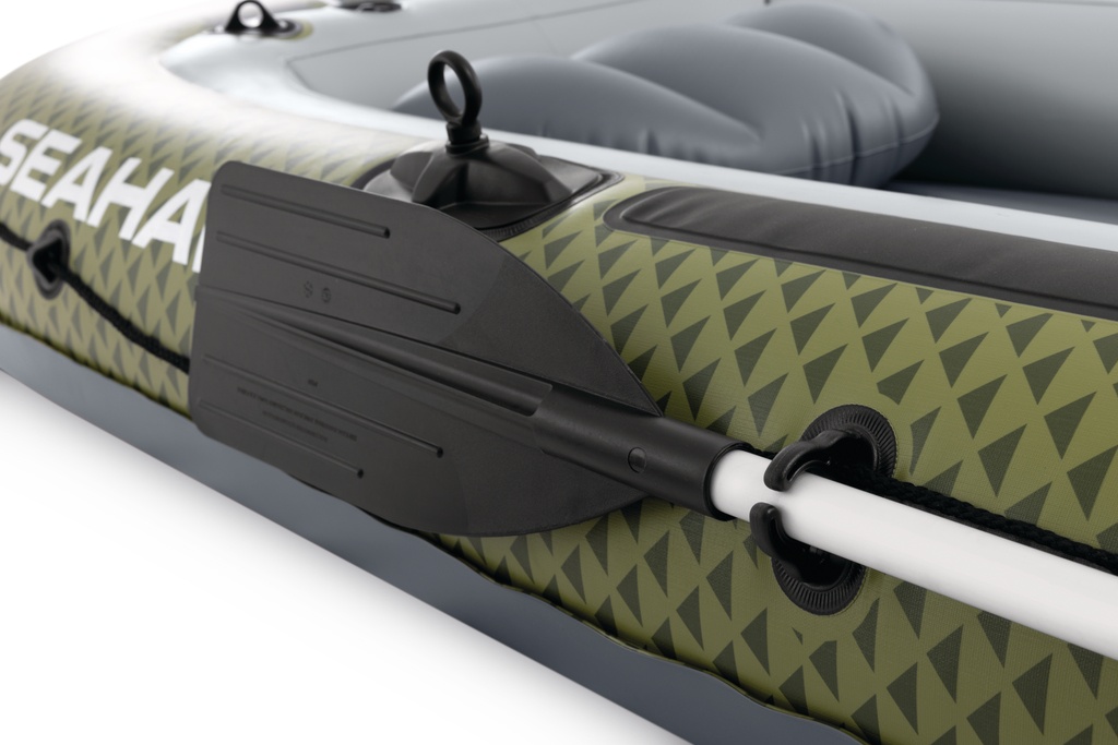 Łódź Intex Seahawk 4 oferuje miejsce dla 4 osób i maksymalną ładowność 480 kg. Wymiary 351 × 145 × 48 cm zapewniają wystarczającą przestrzeń. Łódź posiada trzy komory powietrzne, 2 duże zawory bostońskie do szybkiego pompowania, uchwyty na wędki, uchwyt na podbierak oraz przyłącze do podłączenia silnika.