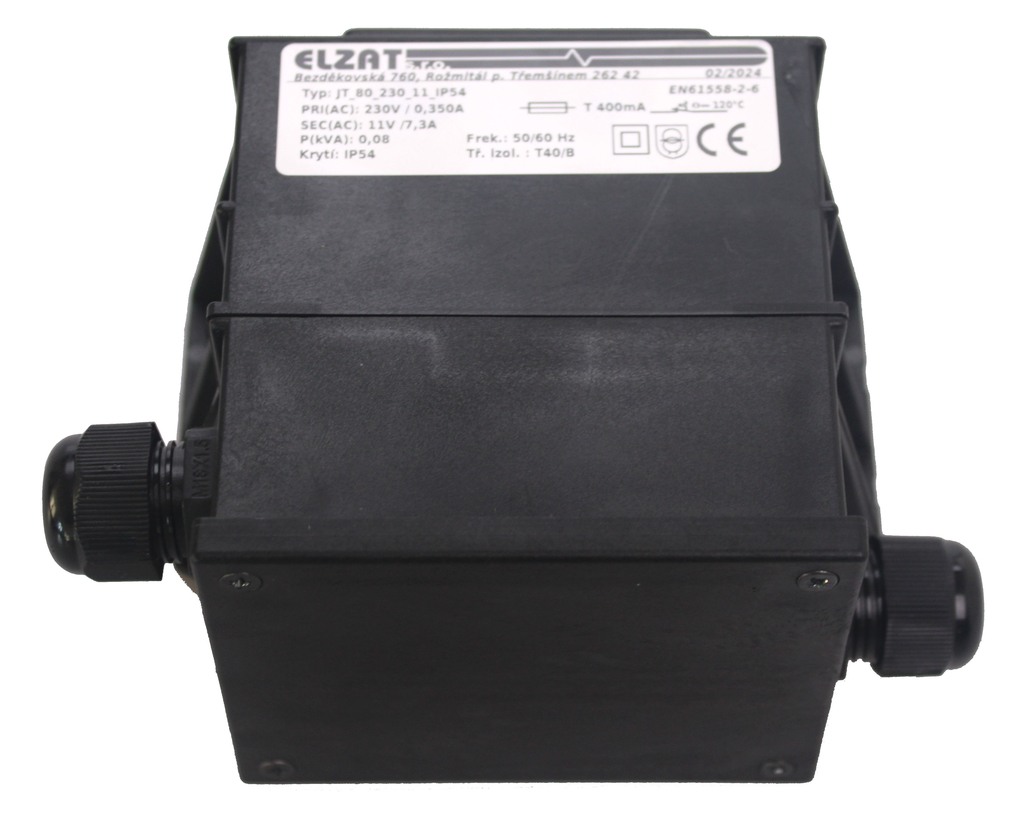 Transformator bezpieczeństwa odpowiedni do oświetlenia LED 230V/11V, 80W o stopniu ochrony IP54 i zaciskach na listwie zaciskowej.
