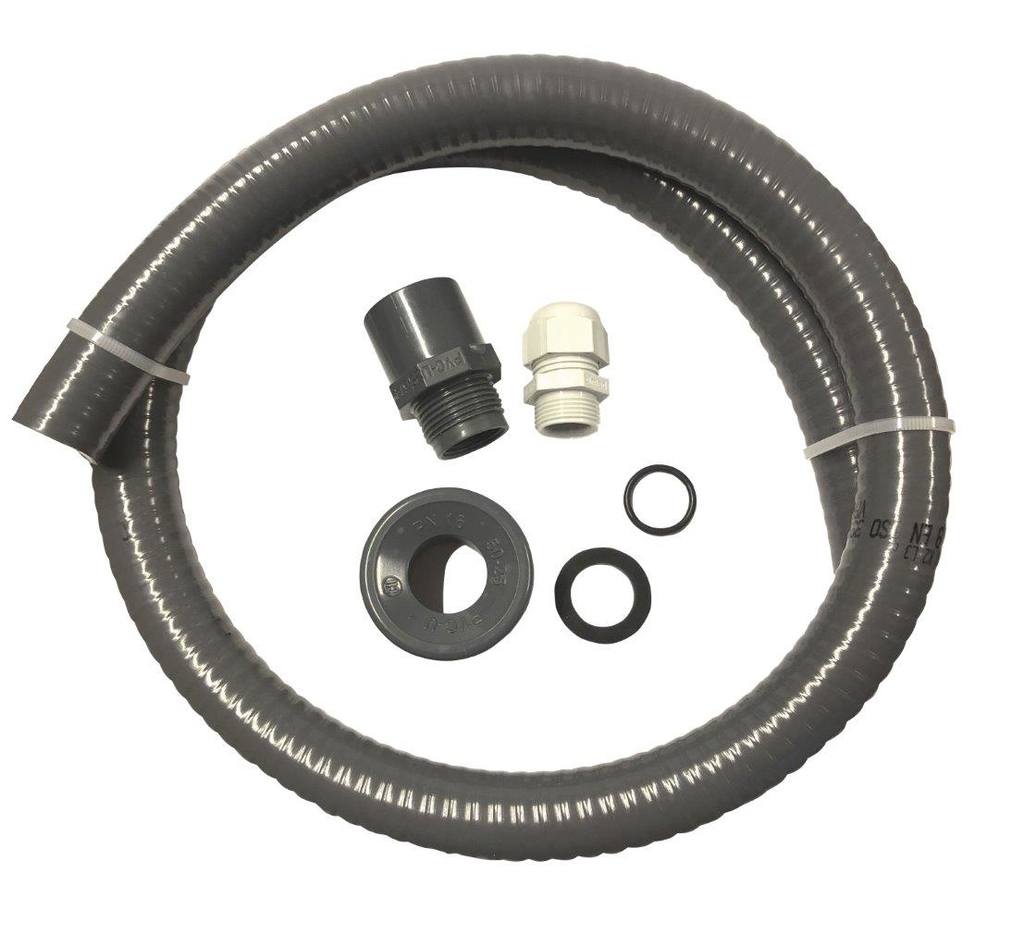 Zestaw węża łączącego z lampą. Zestaw przeznaczony jest do połączenia przelotki lub dyszy przeznaczonej do montażu oprawy ze puszką instalacyjną. Kabel połączeniowy nie jest dołączony.