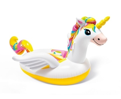 Nadmuchiwany kolorowy jednorożec o wymiarach 198 x 140 x 102 cm.