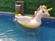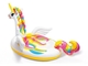 Nadmuchiwany kolorowy jednorożec o wymiarach 198 × 140 × 102 cm.