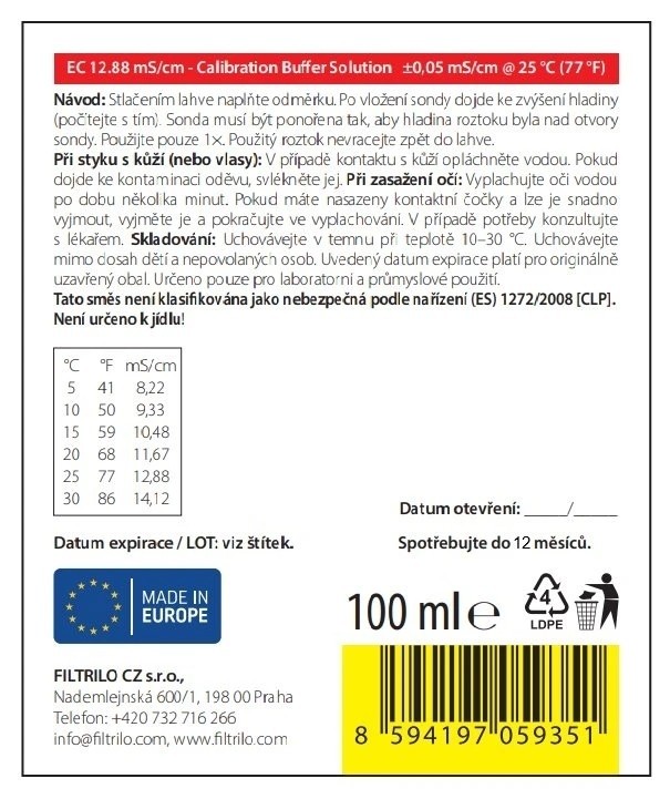 Roztwór kalibracyjny EC 12,88 mS/cm przeznaczony jest do kalibracji i weryfikacji sond przewodności (EC), przyrządów EC (przewodników) oraz czujników EC, zarówno w praktyce laboratoryjnej, jak i w zastosowaniach operacyjnych i przemysłowych. Jest to certyfikowany roztwór kalibracyjny o identyfikowalności metrologicznej, przeznaczony do kalibracji i weryfikacji czujników w zastosowaniach przemysłowych.
