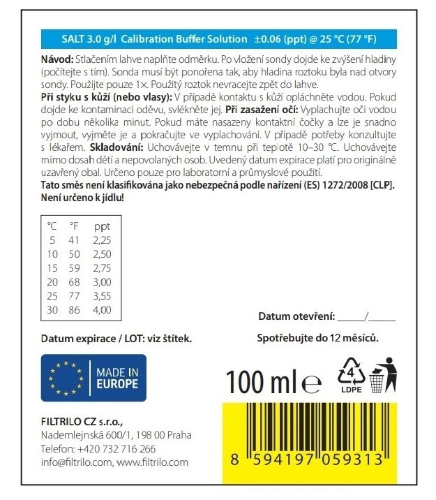 Roztwór kalibracyjny soli NaCl 3,0 g/l przeznaczony jest do kalibracji i weryfikacji przyrządów i czujników do pomiaru zasolenia (NaCl) lub do weryfikacji przeliczeń związanych z przewodnością i TDS (w zależności od ustawień przyrządu). Może być stosowany zarówno w praktyce laboratoryjnej, jak i w zastosowaniach operacyjnych i przemysłowych. Jest to certyfikowany roztwór kalibracyjny o identyfikowalności metrologicznej, przeznaczony do kalibracji i weryfikacji czujników w zastosowaniach przemysłowych.