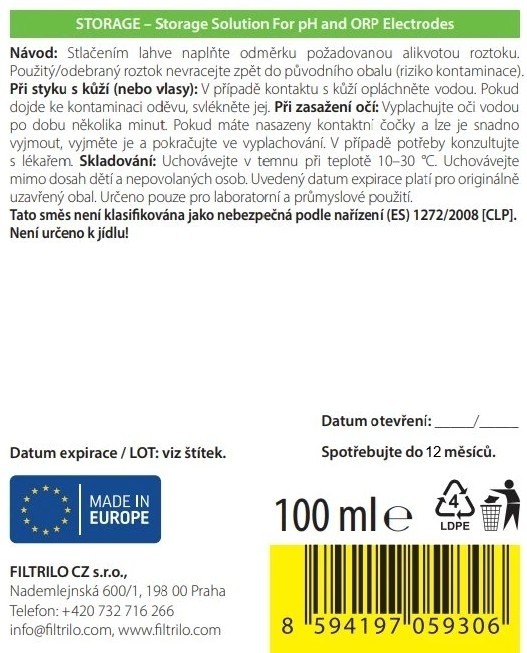 Roztwór STORAGE (3 M KCl) przeznaczony jest do przechowywania i konserwacji elektrod pH i ORP (RedOx) oraz innych sond elektrochemicznych z układem odniesienia na bazie KCl. Jest stosowany w praktyce laboratoryjnej, a także w zastosowaniach operacyjnych i przemysłowych w celu zapobiegania wysychaniu membrany i złącza odniesienia oraz utrzymywania elektrody w dobrym stanie i gotowości do pomiaru.