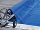 Urządzenie do zwijania plandek basenowych. Urządzenie wyposażone jest w kółka umożliwiające wygodne przemieszczanie.